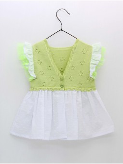 Top niña con canesú de punto calado en color lima con volantitos combinado con tejido plimeti blanco en el bajo. Combínalo con el short de rayas de la misma Colección Lorenzo. Hecho en España