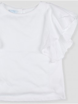 Esta camiseta blanca de manga corta es una prenda imprescindible para el armario de cualquier niña. Su diseño minimalista se realza con los delicados volantes en las mangas, que aportan un aire fresco y elegante. Confeccionada en un tejido ligero y transpirable, resulta ideal para los días de primavera y verano. Perfecta para combinar con faldas, pantalones o shorts de nuestras colecciones, creando looks cómodos y con estilo para cualquier ocasión. Hecho en España
