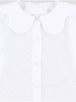 Una blusa básica que no puede faltar en el armario de cualquier niña. Confeccionada en delicado plumeti blanco, destaca por su romántico cuello con ondas y sus mangas largas abullonadas con puños elásticos, aportando comodidad sin renunciar al estilo. El cierre frontal con botones facilita la puesta. Ideal para combinar con las faldas de nuestras colecciones Foque. Una prenda versátil y elegante, perfecta para el día a día o para ocasiones especiales. Hecha en España
