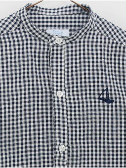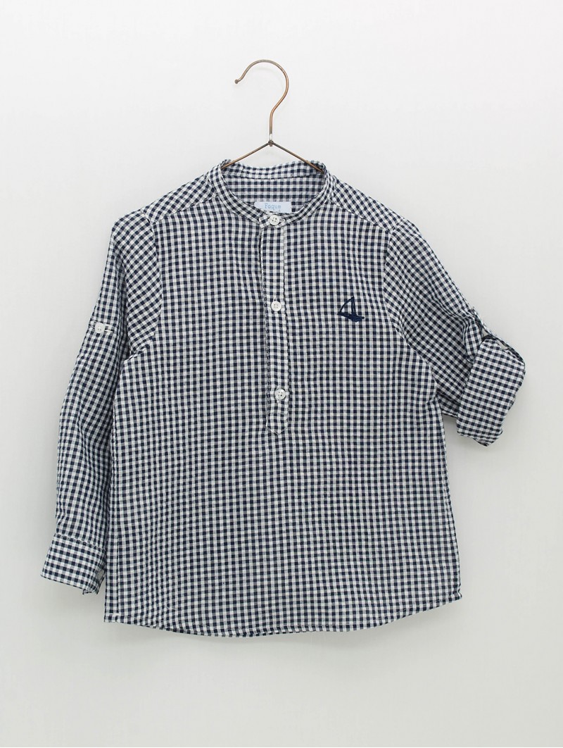 Camisa niño confeccionada en tejido cuadro vichy azul marino, cuello mao y manga larga con botón altura del codo para remangarla. Tallaje de 2 a 14 años. Combínala con los pantalones tintados de nuestras colecciónes Foque, en blanco, azul marino, rojo.... ¿cual es tu combinación preferida? Colección Nico. Hecha en España