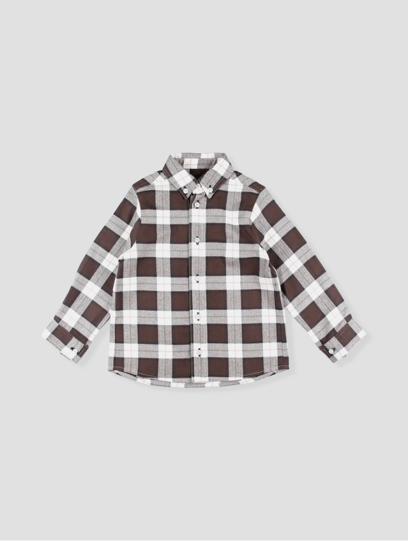 Camisa para niño de la colección Chocolate confeccionada en suave tejido de cuadros en tonos chocolate y gris. De corte clásico, presenta cuello camisero con botones y el velero de Foque bordado en el pecho. Perfecta para combinar con nuestros pantalones de micropana o tintados básicos. En la imagen del look se completa con calzado Pisamonas para un estilo cómodo y con personalidad. Hecho en España
