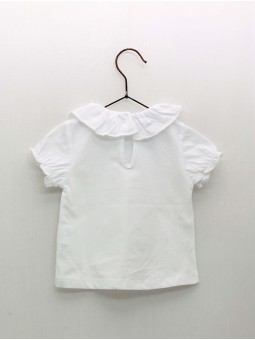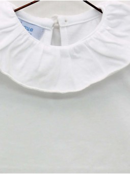 Camiseta para bebé niño/niña confeccionada en tejido 100% algodón de manga corta y cuello volante, color blanco. Botones en la espalda. Un básico que podrás comnibnar con ranitas, peleles. Hecha en España