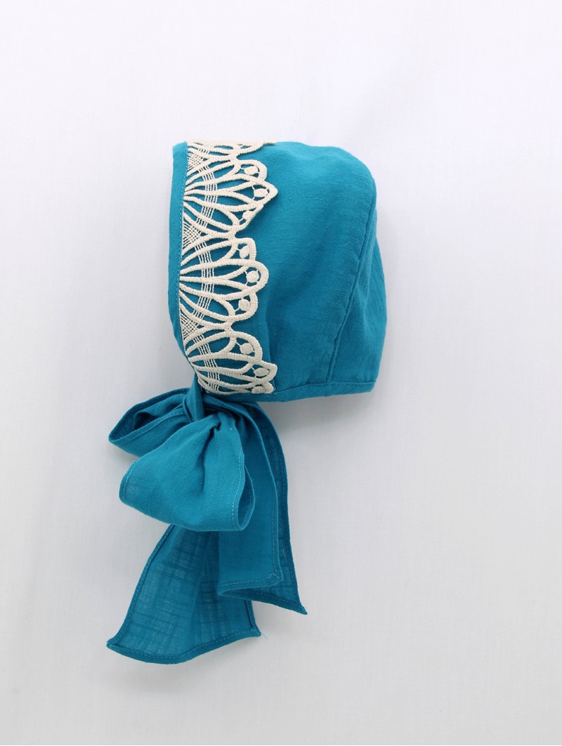 Capota bebé niña confeccionada en tejido efecto bambula 100% algodón en color azul petróleo, se anuda con una lazada al tono y lleva en el empiece una puntilla rústica beig. Combínala con el jesusito de la misma Colección Cleo referencia 2415925. Diseñada y confeccionada en España.