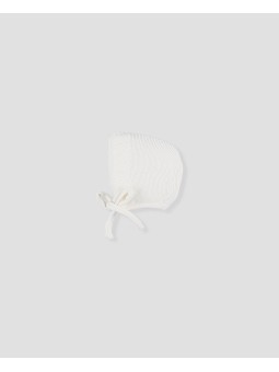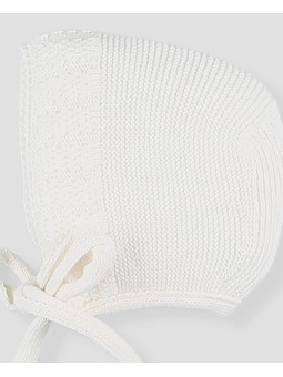 Capota de punto para bebé en tono crudo, perfecta para complementar looks de bautizo o primeras puestas. Su diseño combina texturas de punto bobo y detalles calados en el frontal, rematada con un delicado encaje a tono que aporta un aire clásico y refinado. Se ata cómodamente bajo la barbilla para asegurar un ajuste perfecto. Esta capota pertenece a la colección El Teatro y combina a la perfección con la toquilla y el abrigo de punto a juego. Hecho en España