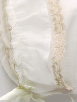 Capota bebé niña confeccionada en tejido de gassa 100% algodón, lazo raso al tono, puntilla de tul y rulillo en el remate. Colección Betania. Tallaje de 0 a 36 meses. Diseñanada y confeccionada en España