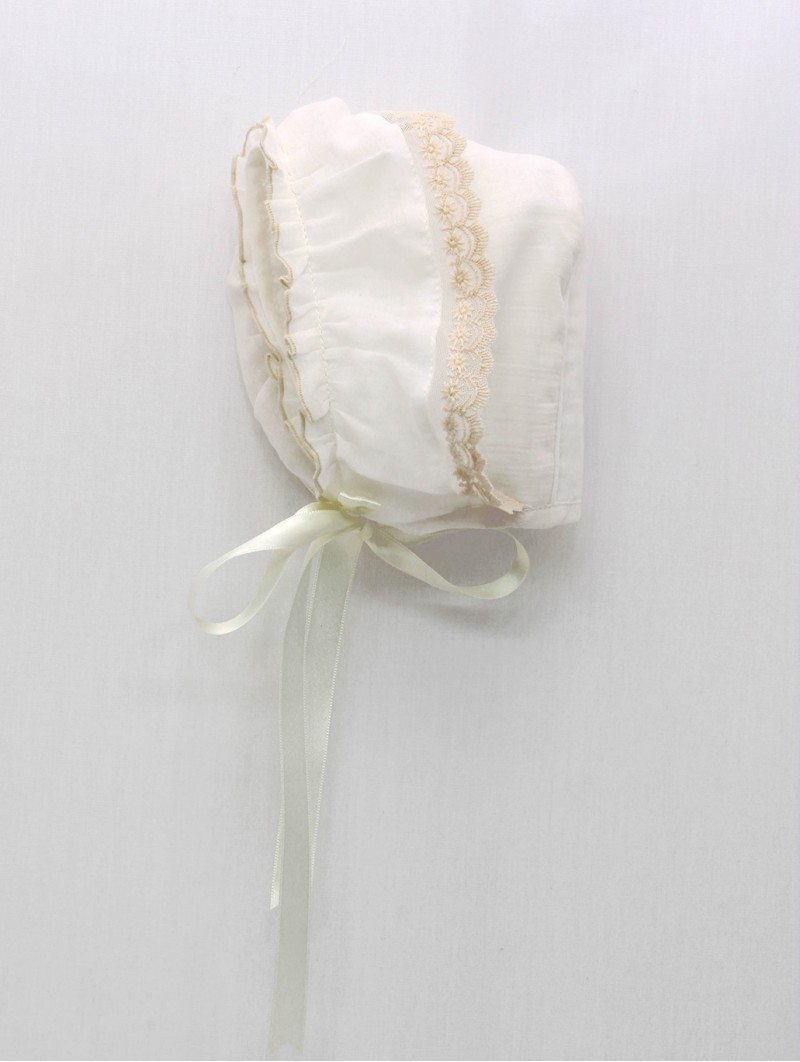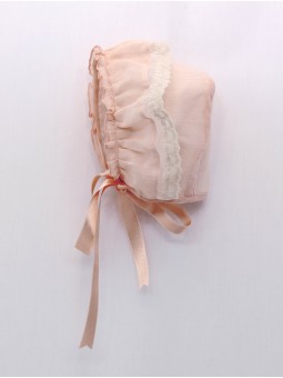 Capota bebé niña confeccionada en tejido de gassa 100% algodón, lazo raso al tono, puntilla de tul y rulillo en el remate. Colección Betania. Tallaje de 0 a 36 meses. Diseñanada y confeccionada en España