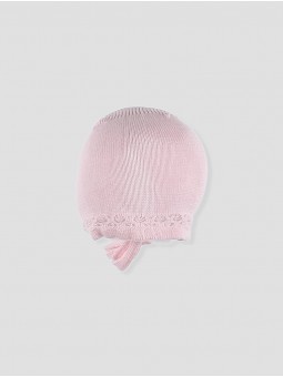Capota integral para bebé niño/niña de algodón tejida en punto liso con empiece calado, tira cordón de punto al tono. Combínala con las prendas de la Colección La Toscana. Hecha en España