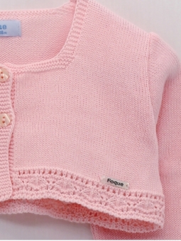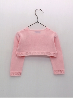 Chaqueta confeccionado en punto 100% algodón, escote cuadrado, cintura y mangas con ondas y calados. Disponible en varios colores. Hecha en España