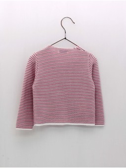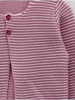 Chaqueta larga bebé niño niña de punto listada. Cuello redondo, abrocha con dos botones al tono remates en blanco, chapa corporativa rectangular nacarada. Dispoble en varios colores, elige la tuya verde agua, amarillo, crudo,celeste o malva. Diseñada y confecionada en España.