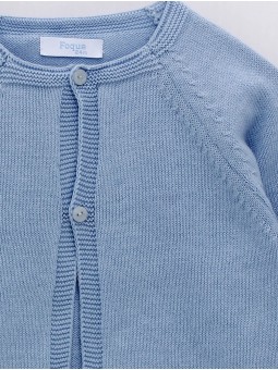 Chaqueta larga para bebé niño en punto de algodón liso, cuello redondo, manga ranglan y detalle bolsillos simulados. Abrocha en el delantero con dos botones al tono. Disponible en varios colores. Hecha en España. Ideal para combinar con los conjuntos de nuestras colecciones Foque.