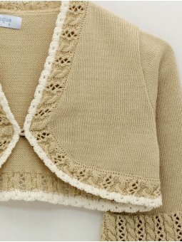 Chaqueta para niña tipo torera de puntas redondas, en punto liso, manga acampanada combinando ochos con calados y empieces contrastados. Ideal para looks de ceremonia. Diseñada y confeccionada en España