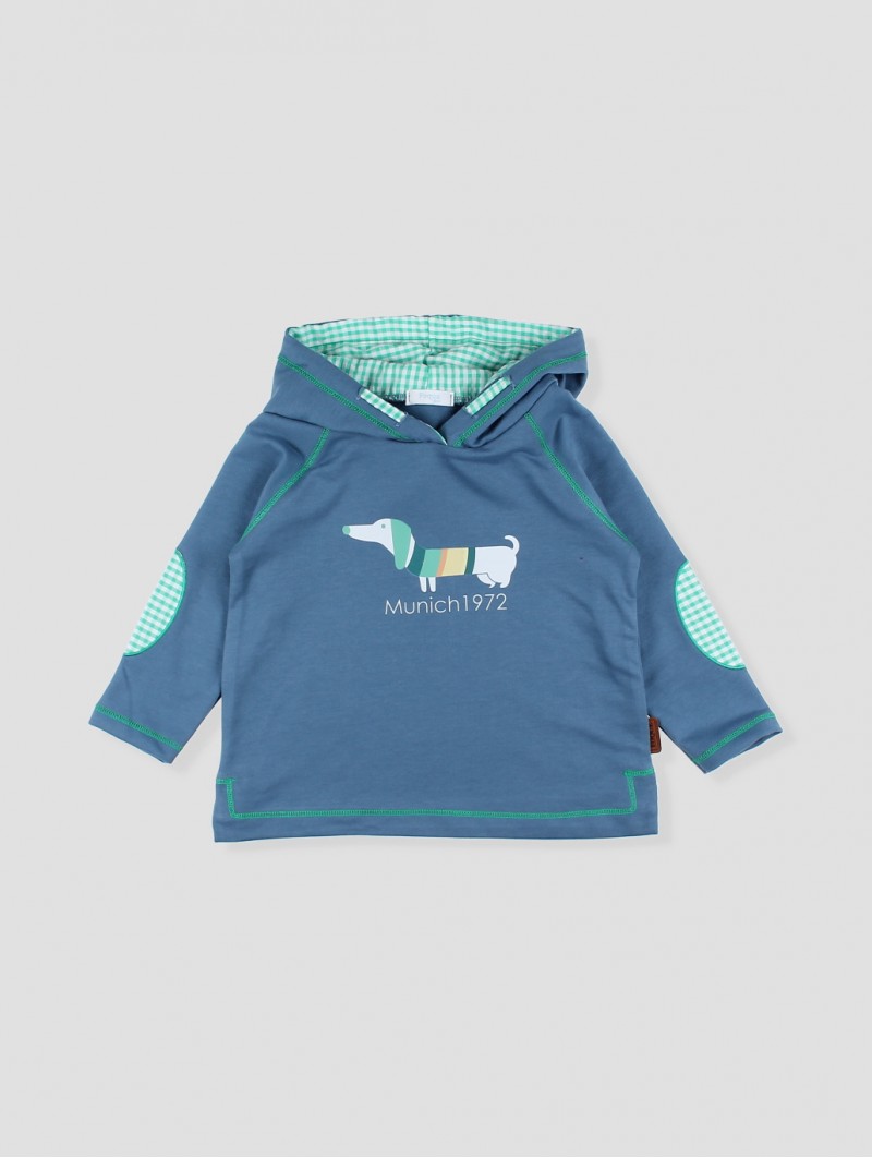 Sudadera con capucha para niño/niña con diseño alegre y divertido. Confeccionada en algodón, presenta un simpático estampado frontal de perro salchicha y coderas a contraste en tejido vichy verde, al igual que la capucha que está forrada con ese mismo cuadrito, aportando un toque clásico a una prenda moderna. Ideal para días de paseo o juegos, manteniendo a los pequeños cómodos y abrigados. Un imprescindible para el entretiempo. Combínalo con las prendas de la colección Munich. Hecho en España.