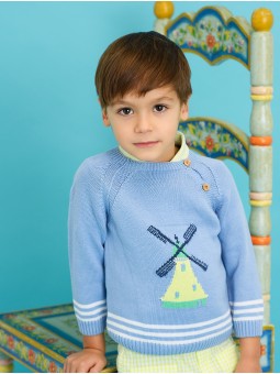 Jersey para niño/niña en punto liso color azulina de cuello redondo con abertura lateral con dos botones de madera, empieces de canalé y listados en color blanco a contraste, exclusivo diseño Foque de un molino de viento en tono lima en el delantero. Combínalo con el pantalón corto cuadro vichy y el polo piqué de la misma colección Provenza. Guapo, cómodo y con estilo. Hecho en España.