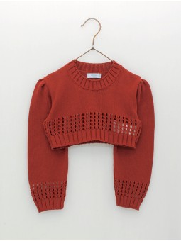 Jersey de punto para niña corto y con manga farol. Detalle de calados en puños y bajo. 100% algodón. Disponible en varios colores. Combínalo con nuestros conjuntos para niñas de la colección. Un básico super ponible para las noches de verano.