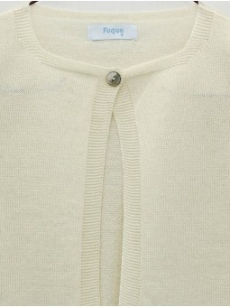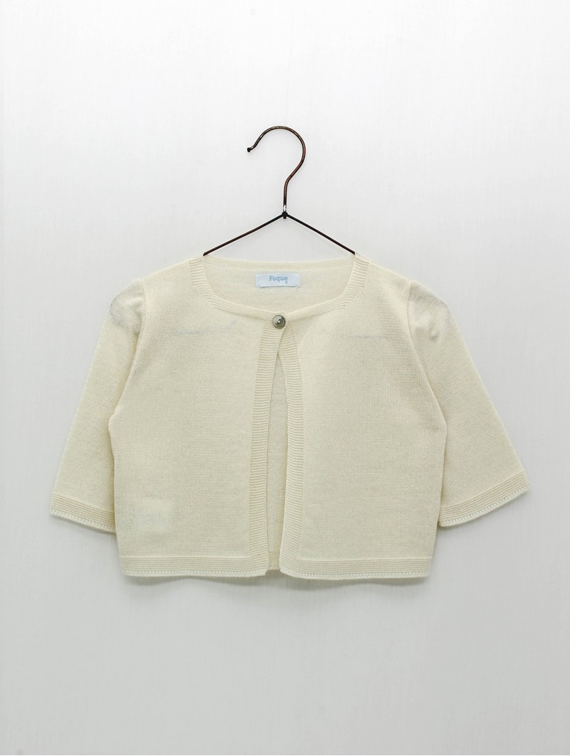 Chaqueta para niña, 100% hilatura de algodón crudo de corte largo en punto liso, manga francesa y cierre con un único botón en el cuello. Diseñada y confeccionada en España.