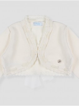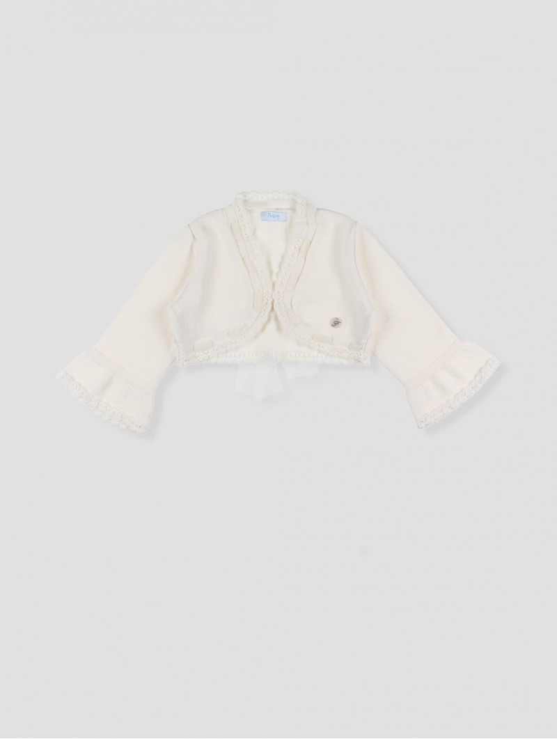 Este bolero de punto es el complemento ideal para los momentos más especiales. Confeccionado en un tejido suave y delicado, cuenta con detalles de encaje en el escote y puños acampanados que aportan un toque romántico. Su diseño corto permite lucir el vestido sin perder elegancia, mientras que el lazo de tul en la parte trasera añade un acabado encantador. Perfecto para ocasiones especiales, ceremonias o eventos familiares. Hecho en España