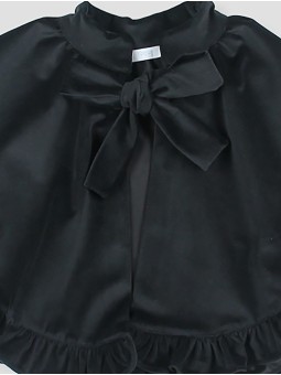 Esta capa de niña en terciopelo negro es la prenda perfecta para completar los conjuntos más especiales de la colección El Ballet. Con corte redondeado, cuello alto y cierre con lazada al tono, aporta un aire sofisticado y envolvente. El volante fruncido en todo el bajo añade movimiento y feminidad al diseño, que combina elegancia y calidez para los días más fríos. Ideal para vestir sobre vestidos o jesusitos en ocasiones señaladas. Hecho en España