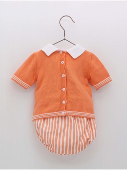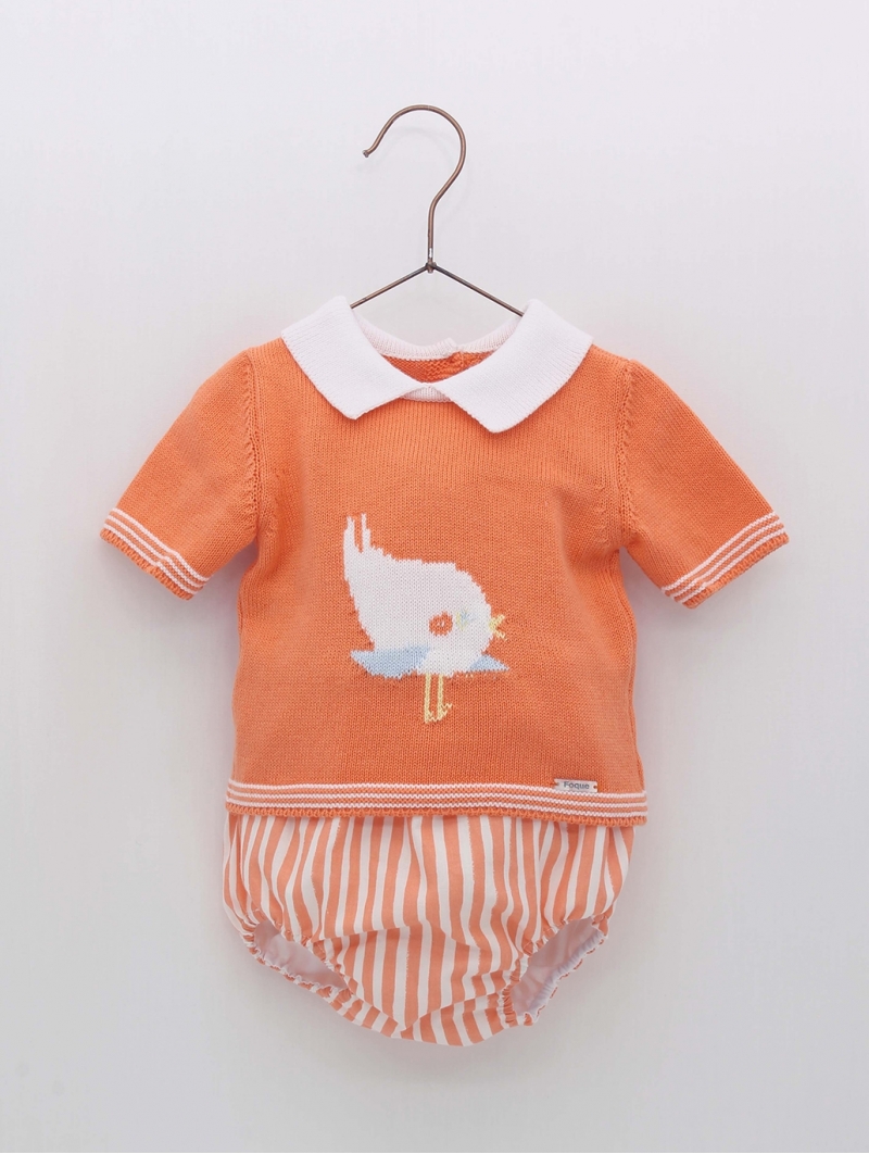 Conjunto de jersey manga corta en color naranja con dibujo de un pajarito en el delantero, listado en mangas y cintura, cuello de punto a contraste, braguita en tejido exclusivo Foque de rayas. Colección Pajaritos. Hecho en España.