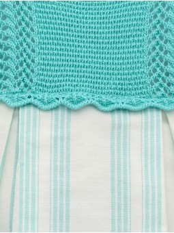 Conjunto para bebé niña formado por vestido sin mangas con cuerpo de punto con calados en color verde agua, lacitos en los hombros de tela a juego con el tejido de rayas al tono de la falda. Braguita punto liso con lacitos de raso. Completa el look con la capota y chaqueta de la misma Colección Esmeralda, referencia 2311834 y 2311843. Confeccionado en españa
