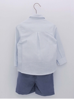 Conjunto para niño formado por camisa de manga larga, con cuello camisero en tejido milrayas y pantalón corto de lino en color azulina. Colección Ceremonia Acuarela. Tallaje de 2 a 14 años. Confeccinado en España