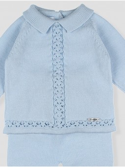 Conjunto de primera puesta para bebé niño confeccionado en hilatura 100% algodón color azul celeste, jubón con espiga calada en el delantero, con cuello camisero de punto, pantalón punto con pie al tono. Lleva una chapita corporativa Foque en la cintura. Perfecto para los primeros dias de tú bebé. Tallaje de la 0 a la 18 meses. Colección La Toscana. Diseñado y confecionado en España