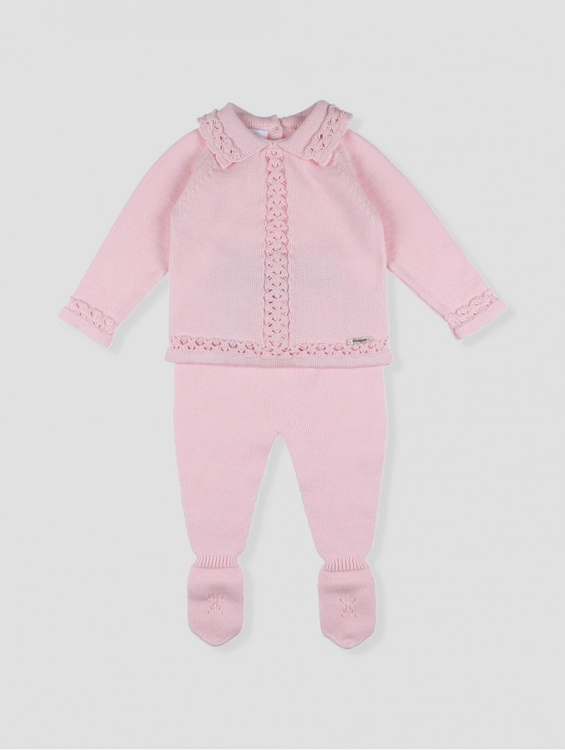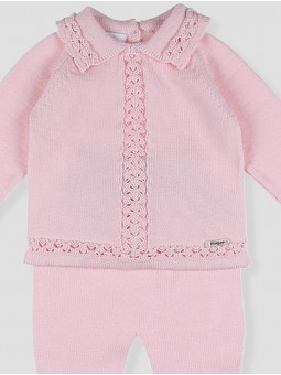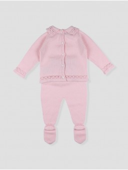 Conjunto de primera puesta para bebé niña confeccionado en hilatura 100% algodón color rosa, jubón con espiga calada en el delantero, con cuello de punto empiece ondas y detalle calado, pantalón punto con pie al tono. Lleva una chapita corporativa Foque en la cintura. Perfecto para los primeros dias de tú bebé. Tallaje de la 0 a la 18 meses. Colección La Toscana. Diseñado y confecionado en España