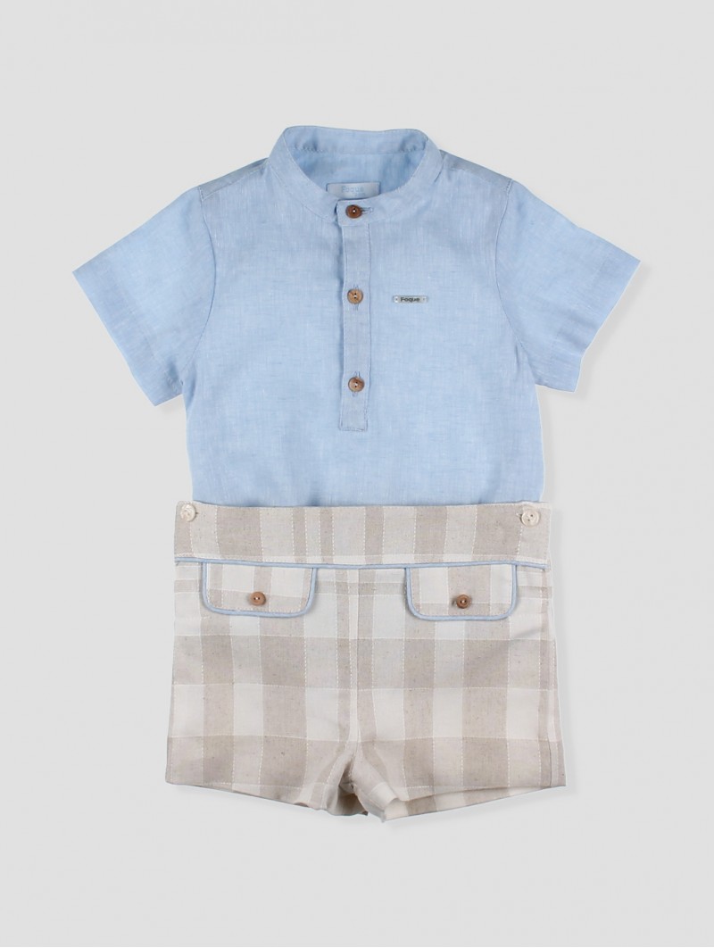 Conjunto niño formado por camisa mezcla lino algodón en color azul celeste de manga corta y cuello mao, pantalón corto bolsillos simulados cuadros beig, cintura ajustable y botones en laterales. Colección Venecia. Clásico y atemporal, un estilo que te encantará. Hehco en España.