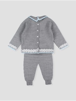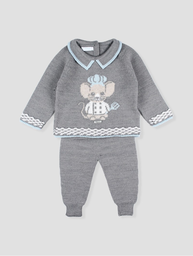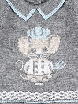 Conjunto de bebé niño compuesto por jubón de punto liso con dibujo de ratón cocinero en intarsia y cuello con vivo a contraste, combinado con polaina lisa en el mismo tono. Un diseño exclusivo de Foque perteneciente a la colección Los Fogones, ideal para los pequeños gourmets de la casa. Cierre trasero completo con botones. Dulce, cómodo y lleno de personalidad. Hecho en España