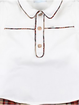 Este conjunto de bebé niño, perteneciente a la colección La Calabaza, combina una camisa blanca con cuello camisero y detalles de vivo a contraste, con un pantalón corto de cuadros en tonos calabaza, burdeos y mostaza. El diseño de la camisa destaca por su tapeta frontal con botones de madera y ribetes que armonizan con el pantalón. Un look de inspiración otoñal que puede completarse con el cárdigan burdeos a juego y zapatos Pisamonas para un resultado perfecto. Hecho en España