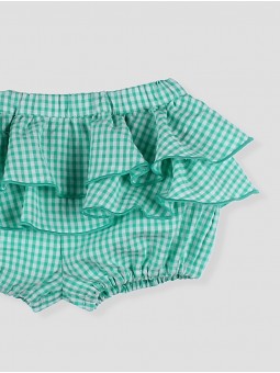 Esta braguita de niña en tejido vichy verde es una opción ideal para los días soleados. Su diseño con volantes dobles aporta un aire dulce y sofisticado, mientras que la cintura y perneras elásticas garantizan un ajuste cómodo y seguro para las más pequeñas. Confeccionada en un tejido ligero y transpirable, es perfecta para combinar con el top de la misma colección Munich. Hecho en España.