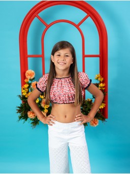 Este pantalón blanco de corte recto y bordado calado es la combinación perfecta de frescura y estilo para los días soleados. Su cintura elástica asegura un ajuste cómodo y práctico. Un diseño versátil que se adapta tanto a looks casuales como a conjuntos más elegantes. Combínalo con blusas ligeras para un estilo veraniego. Hecho en España.