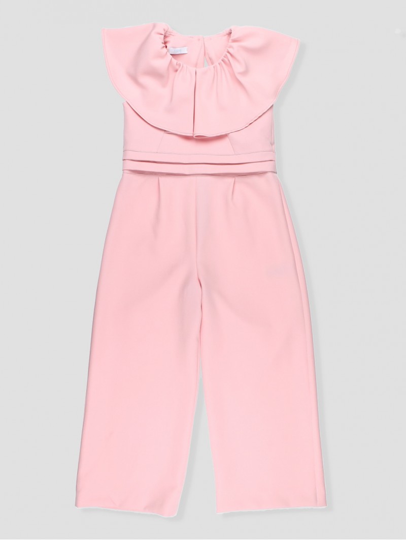 Este mono para niña es la combinación perfecta de elegancia y comodidad. Su cuello con amplio volante le aporta un aire sofisticado, mientras que el cuerpo ajustado y el pantalón culotte crean un equilibrio ideal entre estilo y libertad de movimiento. Su tono pastel realza su delicadeza, convirtiéndolo en una opción ideal para celebraciones y eventos especiales. El cierre trasero facilita el vestido. Una prenda imprescindible en el armario de las más pequeñas. Hecho en España.