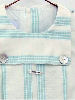 Pelele bebé niño sin mangas, confeccionado en tejido de rayas verde agua, pechera con dos botones en el delantero, chapa corporativa Foque nacarada, botonadura en el bajo y goma elástica. Hecho en España