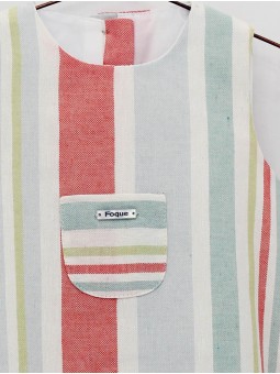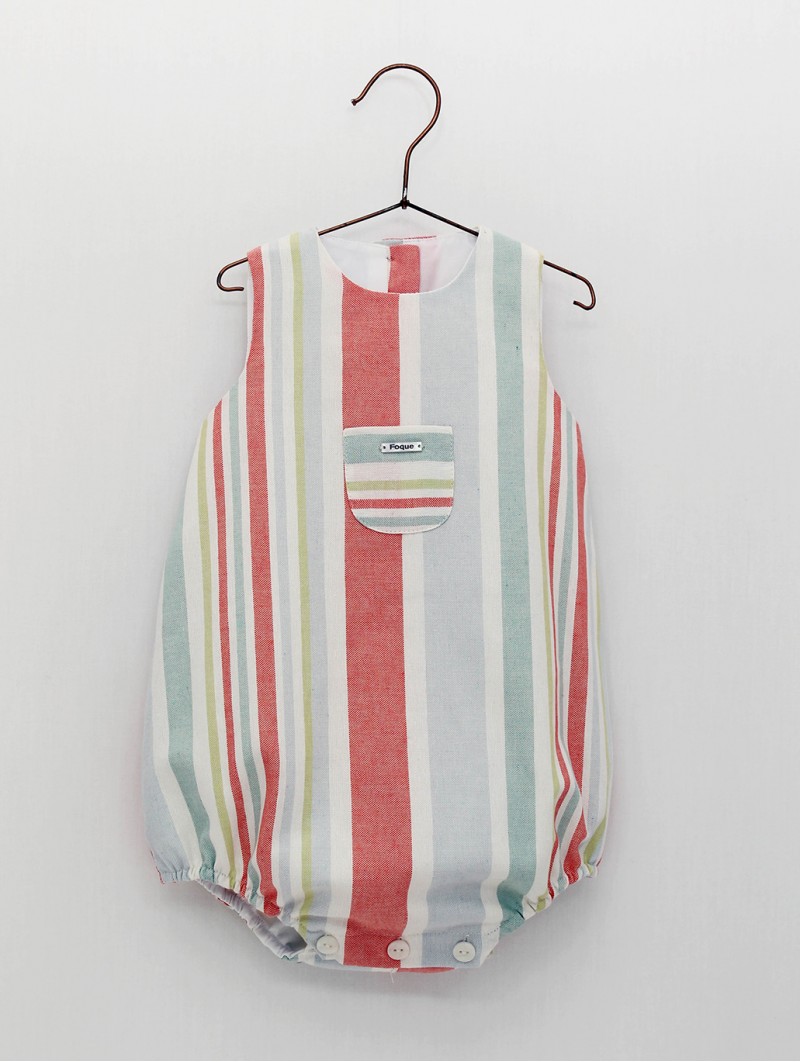 Ranita para bebé niño/niña confeccionada en tejido exclusivo Foque de rayas verticales con detalle en el delantero de un bolsillito al bies con la chapa corporativa nacarada Foque. Colección Lorenzo. Tallaje de 0 a 36 meses. Colección Lorenzo. Hecho en España