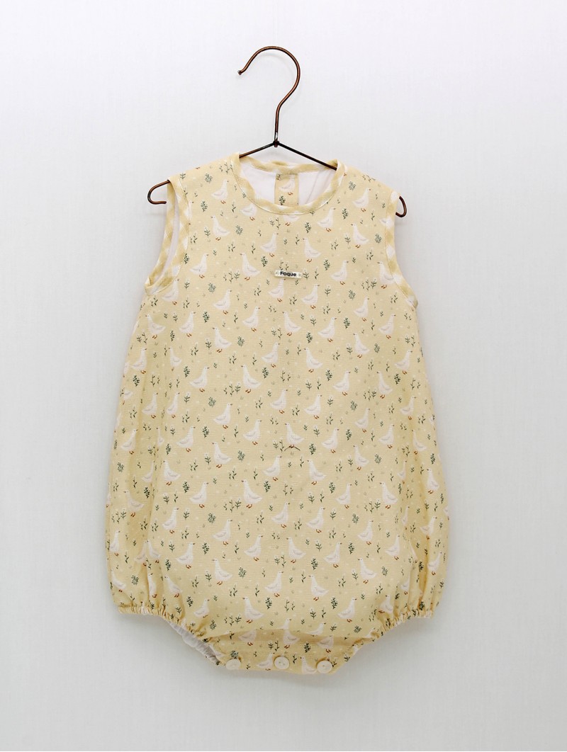 Ranita bebé unisex confeccionada en tejido estampado ocas en tono amarillo vainilla. Cuello redondo, sin mangas. Abrocha en la espalda y la entrepierna. Tallaje de 0 a 36 meses. Colección Aurora. Hecha en España