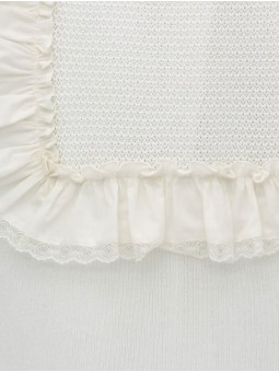 Toquilla para bebé realizada con hilatura 100% algodón en punto liso. Detalle central con volante de puntilla valencienne con ondas. Colección Bautizo. Ideal para arropar a tu bebé. Diseñada y confeccionada en España.