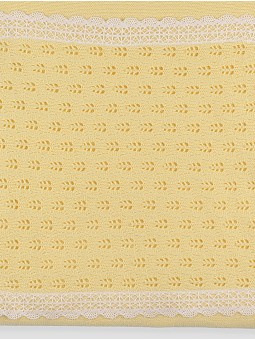 Toquilla para bebé hilatura 100% Algodón, punto liso, pieza central con un diseño de espigas caladas y volante puntilla. Disponibilidad en varios colores. Colección Campiña Inglesa, perfecta para arrullar a tu bebé. Hecha en España