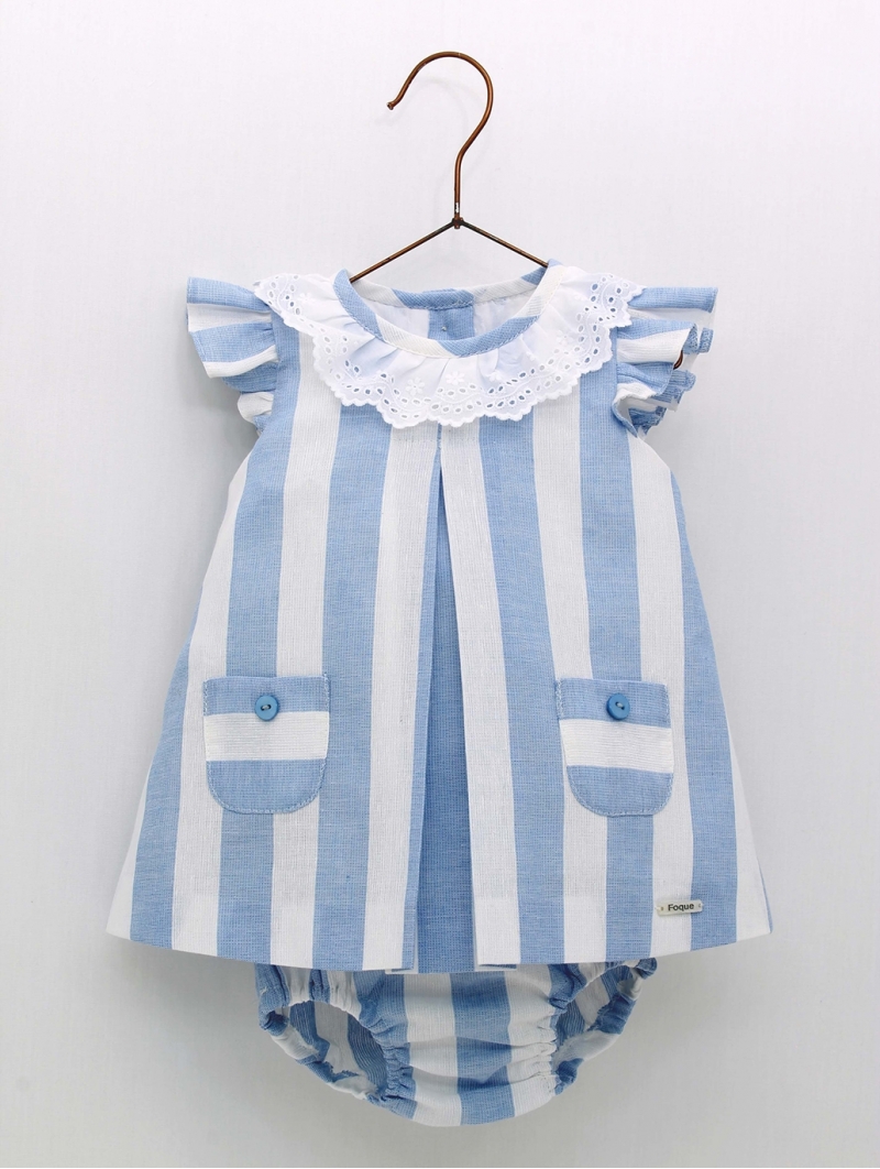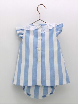 Vestido con braguita tipo jesusito para bebé niña, tejido de rayas en vertical blancas y azules, bolsillos en horizontal con detalle botón al tono, cuello de tira bordada blanca y manga con volantes. Colección Puerto. Combínalo con la chaqueta referencia 2311832 en color azul regata y la capotita a juego referencia 2311821