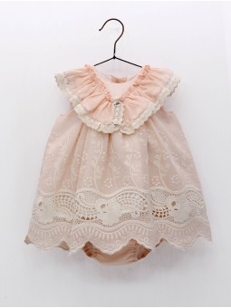 Vestido para niña tipo jesusito confeccionado en tejido 100% gasa de algodón con greca bordada, sin mangas, cuello con volante en forma de pico y braguita cubrepañal al tono. Disponible en rosa, verde y crudo. Completa el look con la chaqueta referencia 2411810. Hecho en España