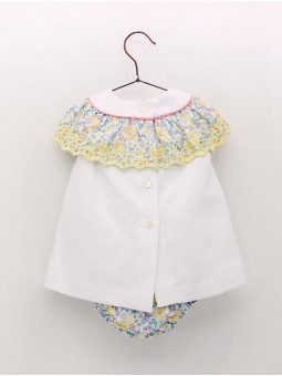 Vestido bebé niña confeccionado en tejido 100% algodón de piqué blanco con dos tablas en el delantero, cuello sin mangas y canesú con volante en tejido de flores liberty, rematado con bordado a contraste flúor. Lleva a juego un cubrepañal en el mismo tejido liberty. Completa el look con la capota referencia 2415934 de la misma Colección Juliette. Hecho en España.