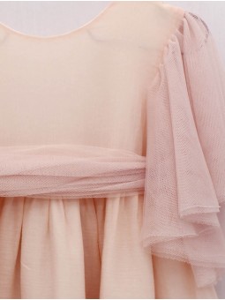 Vestido niña de gasa con greca bordada mangas y cinturón de tul con lazada en la espalda. Colección Betania. Ideal para eventos, disponible en varios colores. Hecho en España