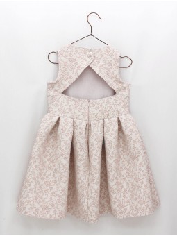 Vestido niña confeccionado en tejido jaqcuard con brillos, top escote barco, sin mangas, entallado, espalda cruzada y falda con tablas. Hecho en España.