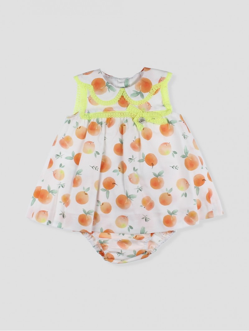 Jesusito confeccionado en tejido 100% algodón con exclusivo estampado melocotones en tonos naranjas, con cuello en ondas con puntillas flúor, sin mangas. Abrocha en la espalda y lleva un forro interior con puntilla. Tallaje de 0 a 48 meses. Colección La Habana. Diseñado en España.