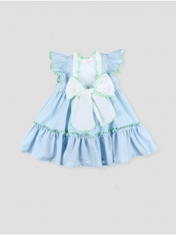 Vestido para niña de cuadros vichy en delicado color azul con detalles bordados en la pechera y mangas con volantes. Incorpora un gran lazo trasero ajustable, que añade un toque sofisticado, encantador y actual. El diseño vaporoso y cómodo para ocasiones distintas ocasiones, manteniendo a las pequeñas frescas y alegres durante todo el día. Confeccionado en algodón. Hecho en España.