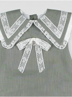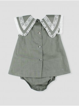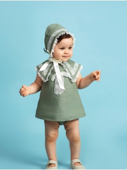 Este adorable conjunto para bebé niña en color verde está compuesto por un vestido con maxi cuello y una braguita a juego. El cuello amplio, decorado con encaje blanco, aporta un contraste elegante y distintivo. Un lazo central complementa el diseño frontal, mientras que los botones traseros facilitan el cambio de ropa. Confeccionado en un tejido ligero de lino, es ideal para ocasiones especiales. Puedes combinarlo con la capota de la misma colección. Hecho en España