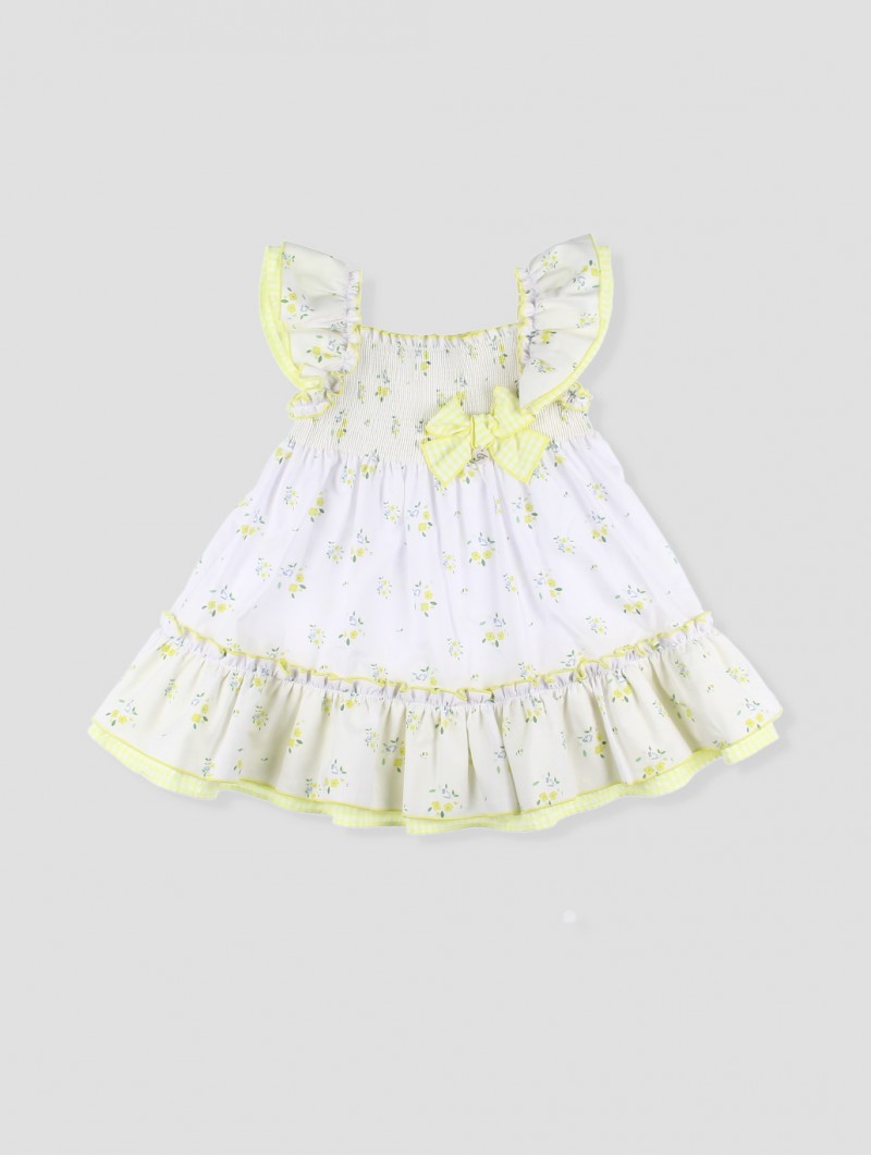 Este precioso vestido para niña combina a la perfección elegancia y frescura. Confeccionado en un tejido de algodón ligero y transpirable. Su diseño presenta un dulce estampado floral en tonos suaves, complementado con volantes en los tirantes y un lazo de cuadro vichy que aporta un toque clásico. Su cuerpo fruncido se adapta cómodamente, ofreciendo libertad de movimiento. Ideal para días soleados, paseos familiares o eventos especiales. Hecho en España