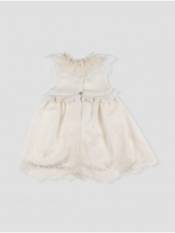 Vestido de bebé en color crudo, que combina un cuerpo de punto suave con una delicada falda de tela bordada. El cuello está decorado con puntilla de guipur, aportando un toque refinado al diseño. La falda fluida incluye encaje en el bajo, mientras que el cierre trasero con botones facilita el cambio. Una prenda que destaca por su elegancia y comodidad. Hecho en España.