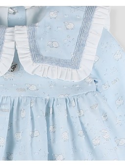 Este encantador jesusito para bebé niña incluye un vestido con manga larga y braguita a juego, ambos confeccionados en un tejido ligero azul con un delicado estampado de ovejitas. El maxi cuello cuadrado con volante blanco y remate en punto celeste aporta un toque dulce, los frunces y volantes en puños y bajo realzan su movimiento. Un diseño versátil, pensado para ofrecer comodidad sin perder estilo. Colección Arrullo, puede completarse con la capota de punto para un total look coordinado.