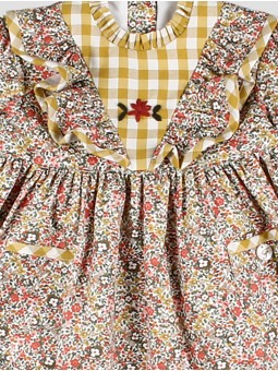 Este vestido para niña de la colección El Viñedo destaca por su alegre combinación de estampado floral y pechera en cuadro vichy mostaza, adornada con volantes coordinados y delicado bordado. El cuello fruncido y los bolsillos decorativos aportan un aire coqueto y otoñal. Las mangas terminan en volante a juego, realzando el estilo clásico con un guiño actual. Puedes completarlo con la capa de punto con capucha y pompón en color teja ref. 2522700 para un total look FOQUE. Hecho en España