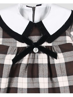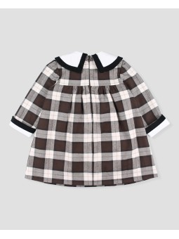 Este vestido para niña destaca por su original diseño de cuadros grandes en tonos marrón. El maxicuello en color blanco con vivo negro aporta un toque elegante y de luz, mientras que el lazo de terciopelo en el pecho añade un aire sofisticado. Los puños blancos con vuelta negra rematan el diseño con delicadeza. Ideal para vestir en eventos otoñales o para el día a día con estilo. Pertenece a la colección Chocolate Invierno 2025-26 de Foque. Hecho en España